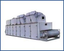 物料同加料器均匀地铺在网带上,网带一般采用12~60目不锈钢丝网,由传动装置拖动在干燥机内移动。干燥机由若干单元组成,每一单元热风独立循环,部分尾气由专门排湿风机排出,废气由调